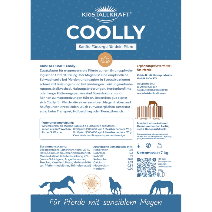 Für Pferde mit einem sensiblen Magen haben wir Kristallkraft Coolly entwickelt: Es ist reich an Meeresalgen mit natürlichem Magnesium. Es enthält schleim- und gelbildende Stoffe wie Leinkuchen und Johannisbrotschrot. Yucca Schidigera ist reich an Saponinen. Traditionelle Kräuter wie Fenchel, Kamille, Engelwurz, Melisse, Pfefferminze, Süßholzwurzel runden die Rezeptur ab.