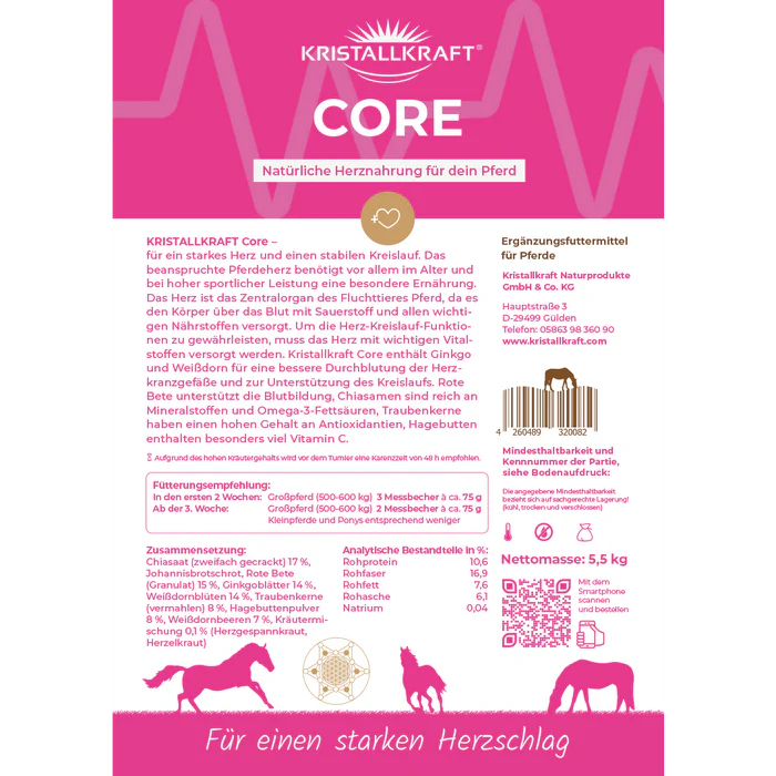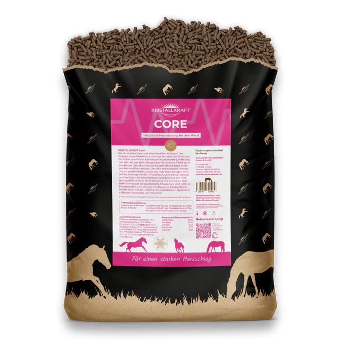 Hinweis: Kristallkraft Core kann als Kurzzeitfütterung, z.B. über die heißen Sommermonate, aber auch als Dauerfütterung z.B. bei bestätigten Herzproblematiken gegeben werden. Auch wenn dein Pferd kein bestätigtes Herzproblem hat, du aber das Herz-Kreislauf-System unterstützen möchtest, tust du deinem Pferd mit Core etwas Gute